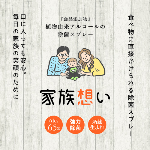 長野県 伊那高遠の地で酒を造り続けて154年の老舗酒蔵「仙醸」がつくる植物由来アルコールの除菌スプレー「家族想い」。アルコール度数65%を有し、除菌・防カビ・防臭・保湿・食品保存に優れた効果を発揮します。酒造会社ならではの純水を使用し極めて純粋度が高く、直接食品に噴霧できる安心の商品です。また、昔から芳香剤として地元信州で親しまれているクロモジエキスも使用しています。